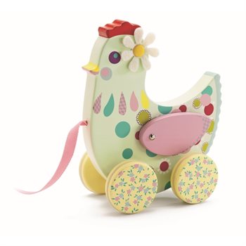 Das liebevolle gestaltete Huhn Cotcotte aus dem Hause Djeco wackelt beim Ziehen mit den Flügeln. Ein ständiger Begleiter der Kleinen!